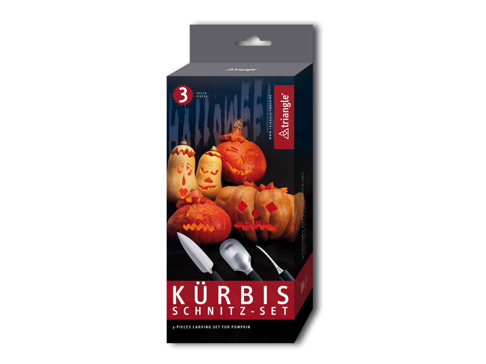 Halloweensæt med 3 stk. værktøjer. Vinkelkniv til at dekorere og udstikke med. Frugtske til at fjerne overskydende frugtkød fra græskar samt kniv med savskær til at skærer lige, runde halvrunde eller bølgeformer. Sættet er meget børnevenligt og leveres med 9 forskellige skabeloner og forslag til dekoration af græskar.