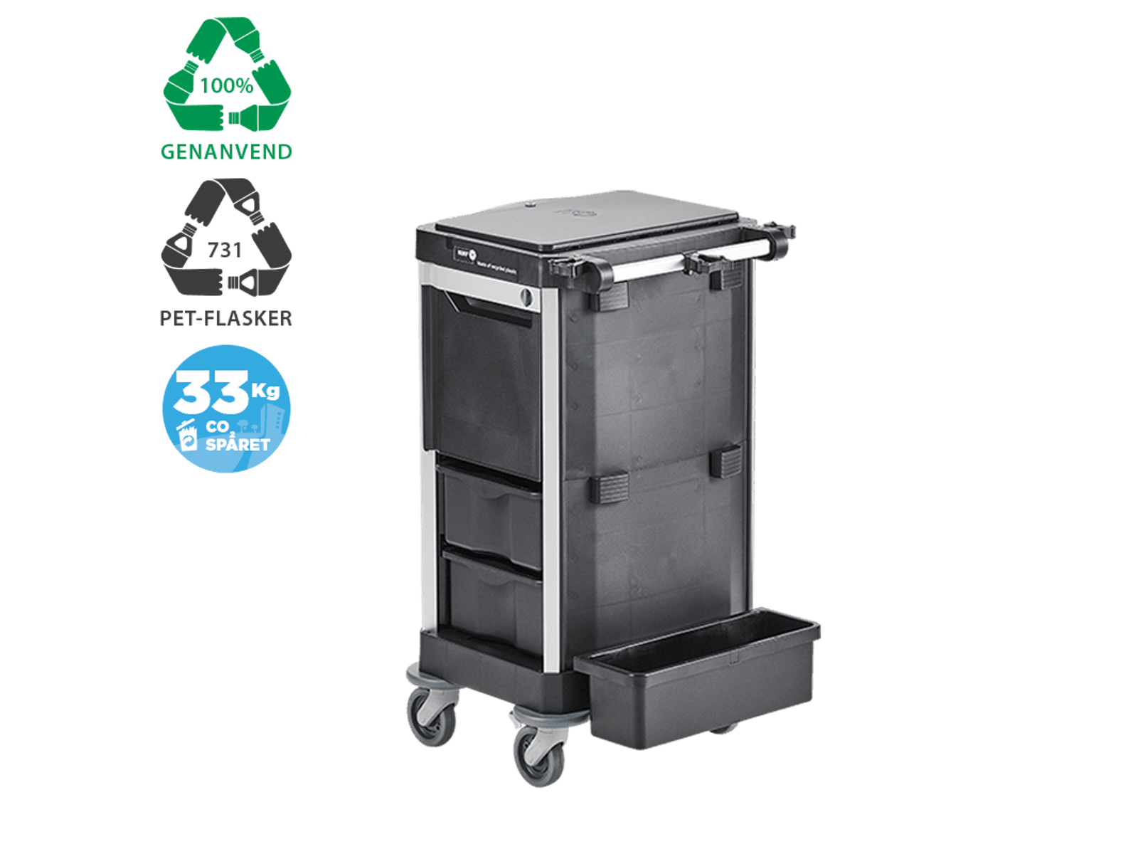 Miljøbevidst, stilren og brugervenlig rengøringsvogn i NMF’s eksklusive designlinje – oplagt til synlig rengøring. Solid vogn med en bæreevne på 300 kg, som kører ubesværet over gulvet. Ergonomisk vogn med 180° justerbart kørehåndtag. Konstruktion af aluminium og 2-lags plast med en levetid på min. 10 år. Fleksibel rengøringsvogn, kan ombygges efter behov on-site. 87% certificeret genanvendt plast af forbrugeraffald indsamlet i Europa – 100% genanvendelig.