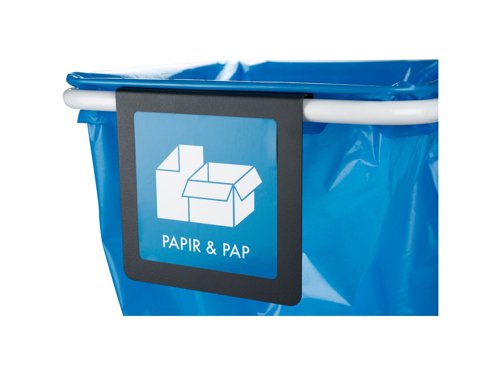 Bukket plade i grå, pulverlakeret stål, til at påsætte sorteringspiktogrammer på 12x12cm. Sættes på affaldsstativet, så man let kan smide affaldet ud i det korrekte affaldsstativ. Kan nemt tages af og sættespå igen.