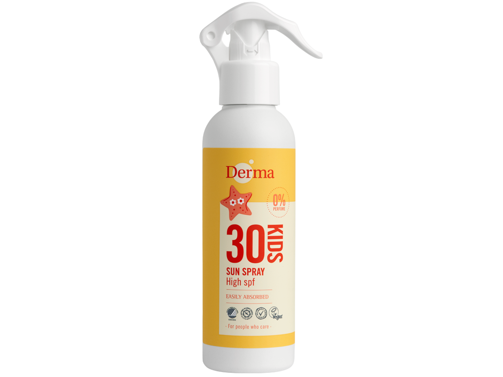 Derma Kids Solspray SPF30 er en allergivenlig og vandfast solcreme med høj solbeskyttelse. Svanemærket og allergimærket. 100% vegansk. 0% parfume - 0% farvestoffer